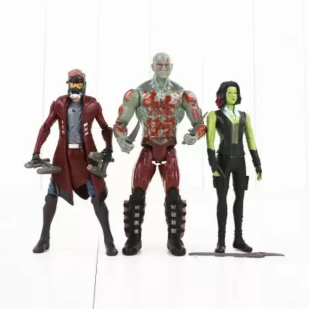 Набор фигурок Стражи Галактики – включает в себя всю команду Часовых Галактики. Команды защищает Землю и другие планеты от межпланетных угроз. Набор фигурок включает в себя 5 персонажей Звездного Лорда, Гамора, Дракса Разрушителя, Енота Ракета, и малыша почвы. В комплекте к лидеру команды идет сменный аксессуар, шлем для выхода в открытый космос.